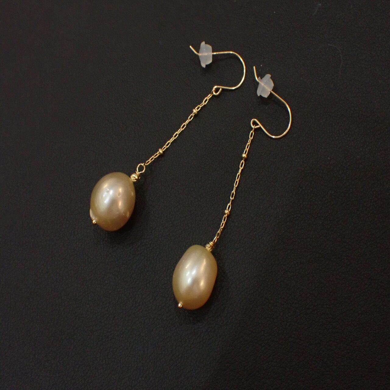 バロック(楕円)型のシロチョウ真珠を使ったロングピアスです。